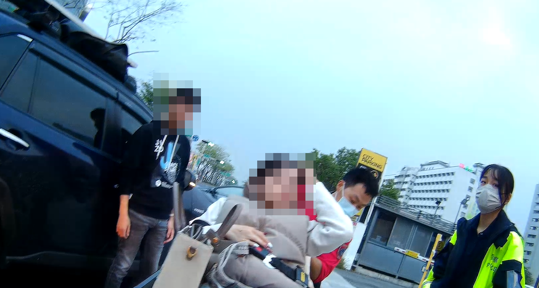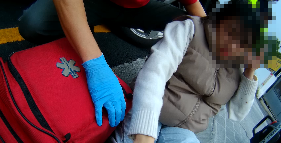 救護人員抵達時,現場為汽機車於路口發生擦撞,患者被自己的機車壓住腳踝,疼痛難耐表情痛苦,機車騎士(女性,21歲)肢體多處擦傷,救護人員立即進行清洗傷口、包紮止血,檢查神經學無明顯異常,將患者送往嘉義基督教醫院就診,後續交由警察及相關單位處理。