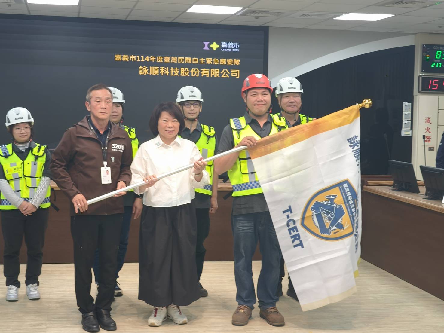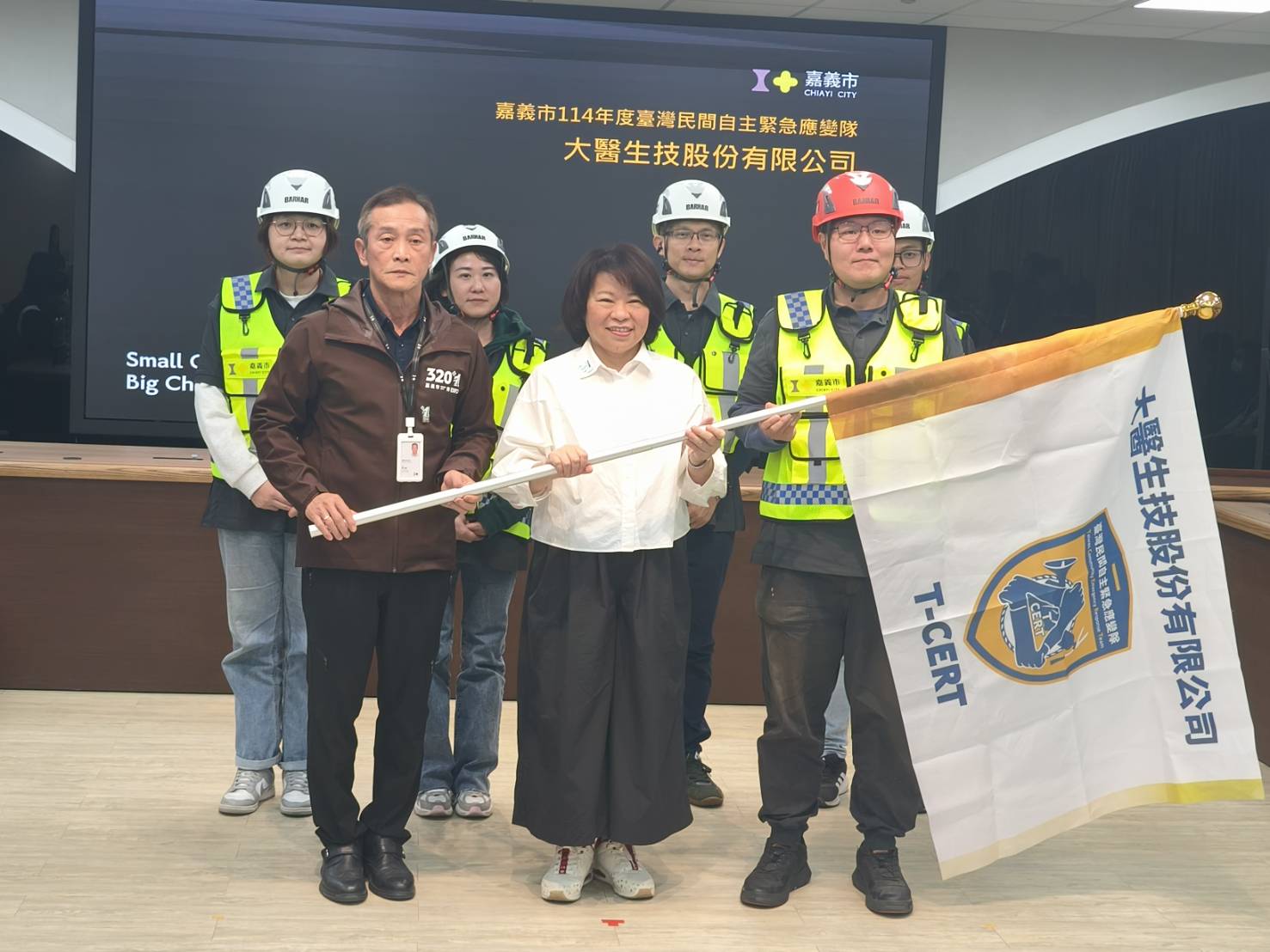 嘉義市政府為彰顯T-CERT制度之重要,並表達對企業投入防災工作的肯定,115年1月13日於市府第1240次市務會議中,由市長親自進行授旗儀式,授予T-CERT隊伍旗幟,象徵本市T-CERT隊伍正式納入地方防救災體系,攜手守護城市安全。
